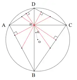 Par conséquent, d'après la propriété ci-dessus, dans un quadrilatère à la fois inscriptible et orthodiagonal, les quatre "hauteurs médianes" concourent au point d’intersection H des diagonales, appelé l'anticentre du quadrilatère inscriptible orthodiagonal [1].