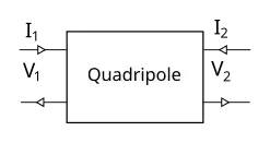 Un quadripôle est un composant ou circuit électronique envisagé comme une boîte noire présentant deux ports électriques[1]. On s'intéresse au courant et à la tension sur chacun des ports, avec les conventions figurées ci-dessous : les courants entrants dans le quadripôle au pôle positif de la tension sont notés positivement.