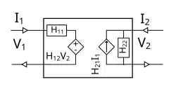 L'approximation petit signal d'un transistor bipolaire est communément modélisé par le circuit équivalent en pi ci-dessus. Ce circuit est un quadripôle actif dont le paramétrage est le suivant. Il faut bien noter qu'ici les grandeurs étudiées ne sont pas les courants et tensions totaux, physiquement présents aux bornes du transistors, mais seulement leur variation autour d'un point de polarisation. Dans un modèle légèrement simpliqué où et sont omis (respectivement nul et infini), le quadripôle actif est représenté par le paramétrage hydride suivant[9], en utilisant les mêmes notations que dans le schéma: