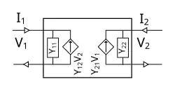 On appelle l'admittance d'entrée du quadripôle ; l'admittance de transfert inverse du quadripôle ; l'admittance de transfert du quadripôle ; l'admittance de sortie du quadripôle. Tous les termes sont des admittances, donc exprimés en siemens.