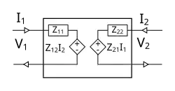 On appelle l'impédance d'entrée du quadripôle ; l'impédance de transfert inverse du quadripôle ; l'impédance de transfert du quadripôle ; l'impédance de sortie du quadripôle. Tous ces termes sont en ohms.