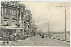Du XIXe siècle jusqu'au milieu du XXe siècle, de nombreuses guinguettes sont installées rue du Pont[Note 2] et le long du quai. Elles préexistent aux usines puis les accompagnent, devenant des lieux de divertissement à la fois pour les ouvriers qui travaillent à proximité, mais aussi pour les Parisiens souhaitant s'encanailler en fin de semaine, leur transport étant favorisé par l'arrivée du train et des navettes fluviales. Parmi les établissements les plus fréquentés, on peut citer « À la Belle Gabrielle » (au no 15 du quai), « La Maison Ribard » ou encore « Le Pavillon de Suresnes », où viennent s'amuser les noceurs et les turfistes de l'hippodrome de Longchamp, situé de l'autre côté de la Seine. Les pêcheurs fournissent les restaurants et les vignerons de la commune, forte d'une tradition viticole ancienne, le « petit bleu », un vin blanc peu onéreux[17],[18]. Les guinguettes disparaissent progressivement, d'abord à cause de la fermeture des lignes fluviales au début des années 1930[19], ensuite par les réaménagements de l'embouchure du boulevard de Versailles et du nouveau pont inauguré en 1951[20],[21],[22], enfin par la disparition des usines, leur destruction et leur remplacement par de grandes entreprises du tertiaire durant la seconde moitié du XXe siècle. « La Belle Gabrielle » est par exemple démolie en 1974. L'établissement devait son nom à une légende locale selon laquelle le roi Henri IV, amateur du vin de Suresnes, y serait venu courtiser la jeune Gabrielle d'Estrées ; une fresque représentant cet épisode décorait le restaurant[23],[24].