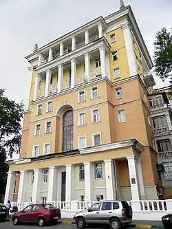 L'immeuble au n° 6 a été construit en 1954 par l'architecte local Youri Boubnov. C'est un grand bâtiment de style néoclassique soviétique de quatre étages. Il reflète la tendance des architectes locaux qui étudiaient profondément dans les années 1940-1950 l'histoire de l'architecture européenne et russe, et se détournant des recherches stylistiques des années 1920-1930 portèrent leurs recherches vers le renouveau du classicisme et de ce qu'on appellera plus tard le classicisme stalinien. Dans cet immeuble résidentiel (dont les appartements étaient réservés en priorité à des directeurs d'usines ou ingénieurs bien vus par le régime), Boubnov a utilisé des techniques typiques de son travail de ces années-là. Il était important dans la conception des façades d'identifier les éléments volumétriques : risalites avec baies (orels) ornées de colonnes doriques qui pour les trois étages supérieur forment des orels à facette reliés par paires tandis qu'au niveau inférieur ils sont soulignés par des guirlandes ondulantes. L'axe de chaque risalite (avant-corps) est formé par des arcs et pour jouir du panorama de la Volga des attiques sont installés. Le rez-de-chaussée et le premier étage sont plus simples et présentent un vrai « travail cyclopéen » de maçonneries. Selon Olga Orelskaïa (docteur en architecture), cet immeuble est l'une des œuvres les plus abouties de Boubnov[13].