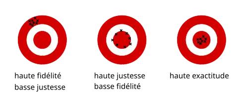 On peut représenter symboliquement la fidélité, la justesse et l'exactitude de la manière suivante :