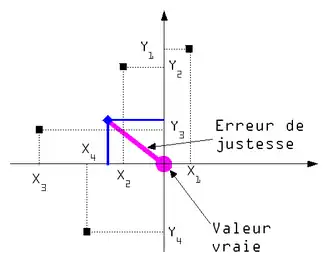 Si l'on effectue une représentation en deux dimensions en considérant la valeur vraie comme l'origine on peut considérer l'erreur de justesse comme la distance entre le barycentre de l'ensemble des mesures et l'origine.