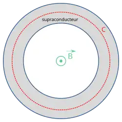 Si l'anneau est suffisamment épais par rapport à la longueur de pénétration , les supercourants n'apparaissent qu'en surface et le champ magnétique est nul par effet Meissner dans le cœur de l'anneau. Si le contour est choisi au cœur l'anneau comme sur la figure ci-contre, la densité de courant électrique est nulle d'où :