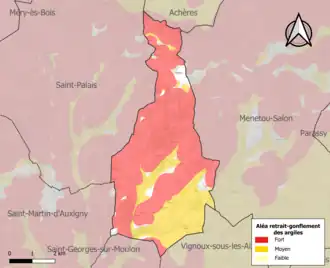 La commune est vulnérable au risque de mouvements de terrains constitué principalement du retrait-gonflement des sols argileux[14]. Cet aléa est susceptible d'engendrer des dommages importants aux bâtiments en cas d’alternance de périodes de sécheresse et de pluie. 95,2 % de la superficie communale est en aléa moyen ou fort (90 % au niveau départemental et 48,5 % au niveau national). Sur les 261 bâtiments dénombrés sur la commune en 2019, 229 sont en aléa moyen ou fort, soit 88 %, à comparer aux 83 % au niveau départemental et 54 % au niveau national. Une cartographie de l'exposition du territoire national au retrait gonflement des sols argileux est disponible sur le site du BRGM[15],[Carte 2].