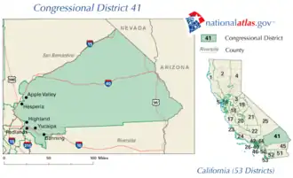 Il comprend les villes de Palm Springs, Menifee, Calimesa, Norco, Lake Elsinore, Wildomar, Rancho Mirage, Palm Desert, Indian Wells, La Quinta et la majeure partie de Corona. Le Représentant du 41e est Ken Calvert, qui a été redécoupé du 42e district. Il contient la majeure partie de la partie ouest de la région de Palm Springs, à l'exception de Cathedral City, ainsi que des villes de banlieue de la région du Grand Los Angeles et des zones périurbaines et rurales du sud-ouest du Comté de Riverside.