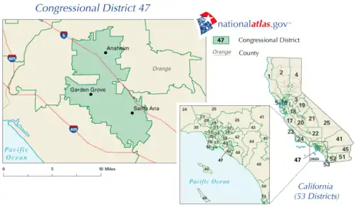 En raison d'un redécoupage après le recensement des États-Unis de 2010, le district s'est déplacé vers l'ouest dans certaines parties du Comté de Los Angeles et comprend désormais les îles Catalina et San Clemente. Le district conserve également des parties du Comté d'Orange telles que Garden Grove.