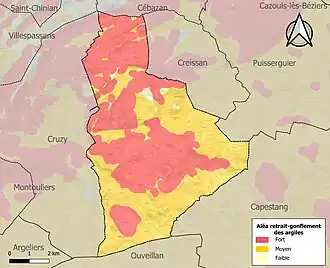 Le retrait-gonflement des sols argileux est susceptible d'engendrer des dommages importants aux bâtiments en cas d’alternance de périodes de sécheresse et de pluie. 99 % de la superficie communale est en aléa moyen ou fort (59,3 % au niveau départemental et 48,5 % au niveau national). Sur les 963 bâtiments dénombrés sur la commune en 2019, 963 sont en aléa moyen ou fort, soit 100 %, à comparer aux 85 % au niveau départemental et 54 % au niveau national. Une cartographie de l'exposition du territoire national au retrait gonflement des sols argileux est disponible sur le site du BRGM[19],[Carte 2].