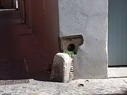 Pierre d'angle trouée du 16e siècle donnant son nom à la rue de la Pierre TrouéeRue de la Pierre Trouée (Carrer de la Pedra Foradada, Carrer de Sant Patomtom, nom actuel depuis 1830)