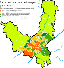 L'Insee compte ainsi cinquante-et-un quartiers à Limoges[2], d'environ 2 000 habitants chacun. Identifiés sous le terme générique d'îlots regroupés pour l'information statistique, ces quartiers à destination statistique sont classés en cinq classes. La première, qui totalise 36 170 habitants, comprend quinze quartiers, essentiellement du centre-ville : C.H.U, Carnot, Hôtel de ville, La Borie, La Cathédrale, La Visitation, Le Champ de Foire, Le Mas-Loubier, Le Roussillon, Les Charentes, Les Émailleurs, Les Galeries, Les Halles, Sainte-Claire et Valadon. La deuxième classe regroupe une population hétérogène et relativement