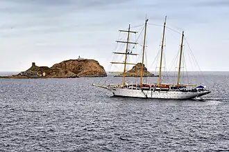 - Mât de misaine avant à voile carré (voile perpendiculaire à l'axe du navire, montée sur des vergues)