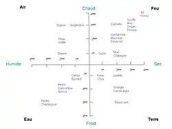 « Comme il y a quatre éléments, et que les combinaisons possibles, pour quatre termes, sont au nombre de six ; mais, comme aussi les contraires ne peuvent pas être accouplés entre eux, le froid et le chaud, le sec et l'humide ne pouvant jamais se confondre en une même chose, il est évident qu'il ne restera que quatre combinaisons des éléments : d'une part chaud et sec, chaud et humide ; et d'autre part, froid et sec, froid et humide. Ceci est une conséquence toute naturelle de l'existence des corps qui paraissent simples, le feu, l'air, l'eau et la terre. Ainsi, le feu est chaud et sec ; l'air est chaud et humide, puisque l'air est une sorte de vapeur ; l'eau est froide et liquide ; enfin, la terre est froide et sèche. Il en résulte que la répartition de ces différences entre les corps premiers se comprend très bien, et que le nombre des uns et des autres est en rapport parfait[5]. »