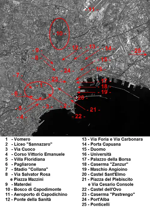 Un lieutenant de l'armée italienne, Enzo Stimolo, après avoir été nommé responsable d'un groupe de 200 insurgés, se distingua particulièrement lors de la prise d'assaut de l'armurerie du château Sant'Elmo (no 20 sur la carte ci-contre), qui ne tomba que le soir venu, non sans faire couler le sang. Les Allemands, barricadés soit à l'intérieur de la villa Floridiana (no 5 sur la carte), soit au stade Arturo Collana, interviennent en grand nombre pour livrer bataille.