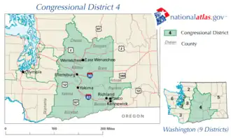 Le 4e district congressionnel de Washington englobe une vaste zone du centre de Washington, couvrant les comtés de Douglas, Okanogan, Grant, Yakima, Benton et Klickitat et certaines parties des comtés d'Adams et de Franklin. Le district est dominé par les zones de Yakima et Tri-Cities. Avec un indice CPVI de R+11, c'est le district le plus Républicain de Washington.