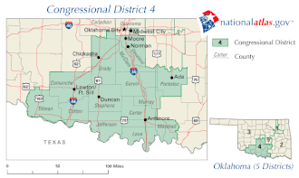 Le 4e district congressionnel de l'Oklahoma est situé dans le centre-sud de l'Oklahoma et couvre (en tout ou en partie) un total de 15 comtés. Ses principales villes comprennent Midwest City, Norman, Moore, Ada, Duncan, Lawton/Ft. Sill et Ardmore. Le district comprend également une grande partie du sud d'Oklahoma City.