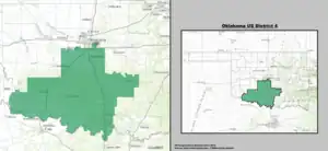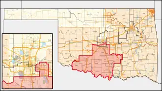 Le district borde le Texas le long de la Red River au sud. Au nord, le district comprend une très petite partie de forme carrée du centre-sud du comté d'Oklahoma (assez pour capturer la ville de Midwest City), puis les comtés de Cleveland, McClain, Grady, Garvin, Murray, Pontotoc, Comanche, Tillman, Cotton, Stephens, Jefferson, Carter et Love.