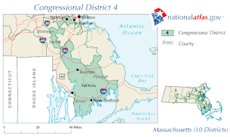 Le district couvre une grande partie de la zone incluse dans le 10e district avant le redécoupage de 1992. Au cours des années précédentes, le district s'étendait de Brookline à Fitchburg. La forme du district a subi quelques changements à compter des élections de 2012, après le redécoupage du Massachusetts pour refléter le recensement de 2010[1]. La plupart du Comté de Plymouth et de la côte sud sont inclus dans le nouveau 9e district. Le nouveau 4e district s'est étendu vers l'ouest pour inclure des villes le long de la frontière du Rhode Island qui se trouvaient dans l'ancien 3e district.