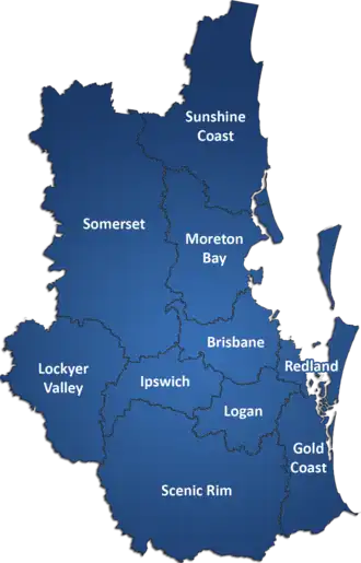 La région du Queensland du Sud-Est se compose des zones d’administration locale suivantes :