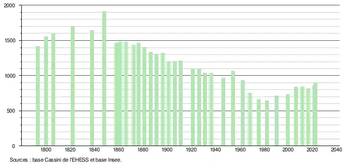 L'évolution du nombre d'habitants est connue à travers les recensements de la population effectués dans la commune depuis 1793. Pour les communes de moins de 10 000 habitants, une enquête de recensement portant sur toute la population est réalisée tous les cinq ans, les populations de référence des années intermédiaires étant quant à elles estimées par interpolation ou extrapolation[16]. Pour la commune, le premier recensement exhaustif entrant dans le cadre du nouveau dispositif a été réalisé en 2006[17].