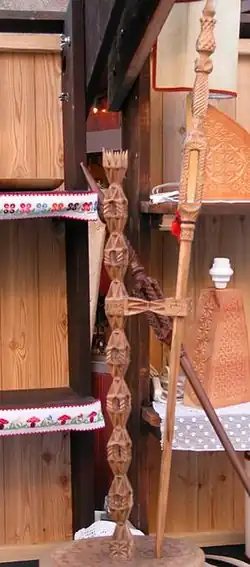 Tige de bois ou d'osier qui peut être décorée, la quenouille sert à maintenir et stocker les fibres qui ne sont pas encore filées, afin qu'elles ne s'emmêlent pas et qu'il soit facile de les utiliser. Les fibres sont enroulées autour de la quenouille et maintenues en place à l'aide d'un ruban.