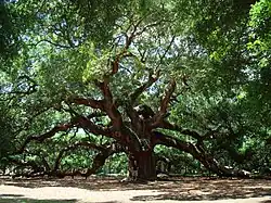 - Le Angel Oak de Johns Island, en Caroline du Sud, près de Charleston, aurait plus de 700 ans. La circonférence du tronc est de 28 pieds (8,5344 m), hauteur de 66,5 pieds (20,2692 m) et la propagation des branches de 187 pieds (56,9976 m)[14].