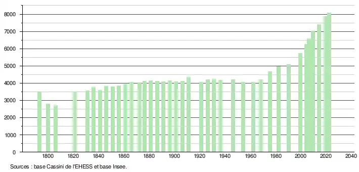 - ↑ Population municipale de référence en vigueur au 1er janvier 2025, millésimée 2022, définie dans les limites territoriales en vigueur au 1er janvier 2024, date de référence statistique : 1er janvier 2022.