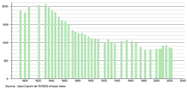 L'évolution du nombre d'habitants est connue à travers les recensements de la population effectués dans la commune depuis 1793. Pour les communes de moins de 10 000 habitants, une enquête de recensement portant sur toute la population est réalisée tous les cinq ans, les populations de référence des années intermédiaires étant quant à elles estimées par interpolation ou extrapolation[40]. Pour la commune, le premier recensement exhaustif entrant dans le cadre du nouveau dispositif a été réalisé en 2004[41].