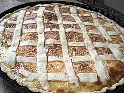 - ↑ Le magazine Gourmand, « 25 tartes et tourtes salées qui changent ! », no 302, 18 septembre 2014-1er octobre 2014, p. 47, propose une pâte à base de 3 œufs, 100 g de beurre, 25 g de saindoux, 250 g de farine, 1 paquet de levure de boulanger et un peu de lait.