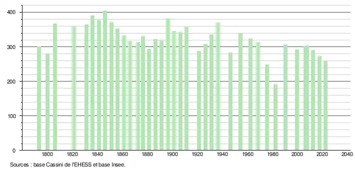 L'évolution du nombre d'habitants est connue à travers les recensements de la population effectués dans la commune depuis 1793. Pour les communes de moins de 10 000 habitants, une enquête de recensement portant sur toute la population est réalisée tous les cinq ans, les populations de référence des années intermédiaires étant quant à elles estimées par interpolation ou extrapolation[41]. Pour la commune, le premier recensement exhaustif entrant dans le cadre du nouveau dispositif a été réalisé en 2007[42].