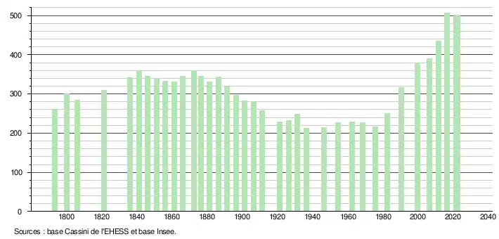 L'évolution du nombre d'habitants est connue à travers les recensements de la population effectués dans la commune depuis 1793. Pour les communes de moins de 10 000 habitants, une enquête de recensement portant sur toute la population est réalisée tous les cinq ans, les populations de référence des années intermédiaires étant quant à elles estimées par interpolation ou extrapolation[12]. Pour la commune, le premier recensement exhaustif entrant dans le cadre du nouveau dispositif a été réalisé en 2006[13].