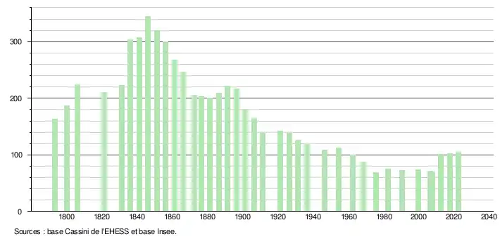 L'évolution du nombre d'habitants est connue à travers les recensements de la population effectués dans la commune depuis 1793. Pour les communes de moins de 10 000 habitants, une enquête de recensement portant sur toute la population est réalisée tous les cinq ans, les populations de référence des années intermédiaires étant quant à elles estimées par interpolation ou extrapolation[27]. Pour la commune, le premier recensement exhaustif entrant dans le cadre du nouveau dispositif a été réalisé en 2007[28].
