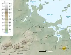 Selon le Bureau du recensement des États-Unis, la ville a une surface totale de 70 km2, dont 44 km2 sont des terres et 26 km2 de l'eau. La région totale est de l'eau de 37.6 %. Quincy se compose des régions côtières étant basses au nord et à l'est qui deviennent plus hauts dans l'élévation comme on bouge au sud et à l'ouest[1].