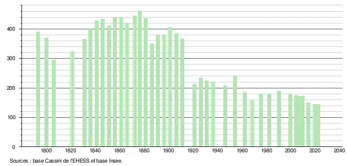 L'évolution du nombre d'habitants est connue à travers les recensements de la population effectués dans la commune depuis 1793. Pour les communes de moins de 10 000 habitants, une enquête de recensement portant sur toute la population est réalisée tous les cinq ans, les populations de référence des années intermédiaires étant quant à elles estimées par interpolation ou extrapolation[30]. Pour la commune, le premier recensement exhaustif entrant dans le cadre du nouveau dispositif a été réalisé en 2004[31].