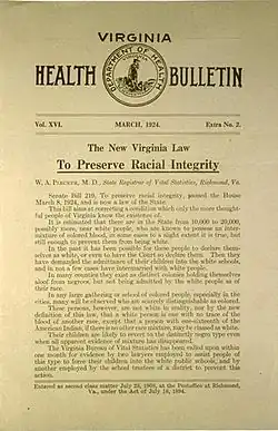 Avant et après la guerre de Sécession, de nombreuses personnes d'ascendance mixte, qui semblaient «blanches» et étaient principalement d'origine blanche, ont été légalement intégrées à la majorité blanche. Mais, petit à petit, les lois des États établissent des normes différentes. Par exemple, une loi de 1822 en Virginie disposait que pour être définie comme mulâtre (c'est-à-dire multiraciale), une personne devait avoir au moins un quart (l'équivalent d'un grand-parent) d'une ascendance africaine. L'acceptation sociale et l'identité propre étaient historiquement les clés de l'identité raciale. La notion du Quart de la Virginie est resté en vigueur jusqu'en 1910, date à laquelle le standard a été remplacé par un seizième. En 1924, en vertu de la loi sur l'intégrité raciale, même la norme du seizième a été abandonnée. Cet acte définissait une personne comme légalement « colorée » (noire) à des fins de classification et à des fins légales si la personne avait une ascendance africaine.