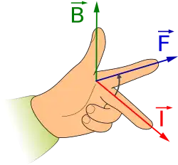 Inversement, la main droite est utilisée pour la règle du démarreur, utilisée dans les machines électriques (un démarreur est un moteur) : un conducteur alimenté en courant dans un champ magnétique subit une force perpendiculaire, dite de Laplace[1].