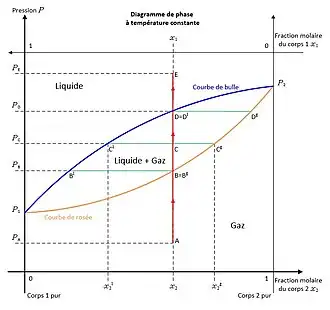 Entre deux domaines représentant des phases seules, il peut exister un domaine dans lequel les deux phases coexistent en équilibre. Par exemple, dans le diagramme ci-contre, il existe, entre les domaines du liquide seul et du gaz seul, un domaine dans lequel les deux phases coexistent. Dans ce type de domaine, les compositions des phases en équilibre sont données par les intersections des courbes limitrophes et de la droite horizontale isobare ou isotherme (selon le type de diagramme). Dans le diagramme ci-contre, au point dans le domaine de coexistence des phases liquide et gaz, la composition de la phase liquide est donnée par le point sur la courbe de bulle et la composition de la phase vapeur par le point sur la courbe de rosée, les trois points étant à la même pression [1]. Au point le corps a une fraction molaire en phase liquide et en phase gaz. Le point , lui, se situe à une fraction molaire comprise entre et . Le segment de droite horizontal qui joint les deux courbes limitrophes du domaine biphasé est appelé conode[1],[2].