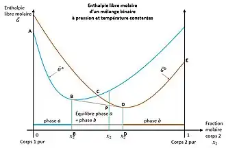 - Dans le diagramme isobare et isotherme ci-contre, l'enthalpie libre molaire d'un mélange binaire est tracée en fonction de la fraction molaire de l'un des constituant. Entre les points A et B la phase est seule. Entre les points D et E la phase est seule. Entre les points B et D, le segment de droite BD représente l'équilibre d'une phase phase de composition et d'une phase de composition . En un point P quelconque de ce segment, de fraction molaire , la règle des moments donne :