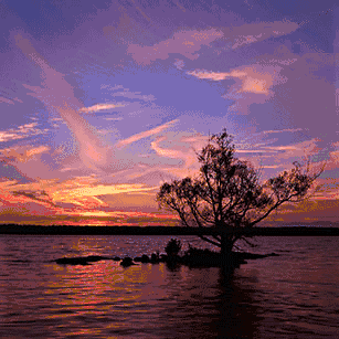 La photo de droite montre l'application de la règle des tiers. L'horizon se situe sur l'une de ces lignes séparant le tiers inférieur de la photo des deux tiers supérieurs. L'arbre se trouve à l'intersection de la ligne de tiers horizontale inférieure et de la ligne de tiers verticale de droite. Par exemple, la partie la plus brillante du ciel près de l'horizon ne tombe pas directement sur l'une des lignes, mais tombe près de l'intersection assez proche de deux des lignes, pour profiter de la règle.