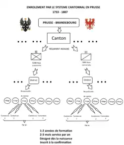 La façon de procéder des officiers-recruteurs conduisit parfois à des incidents ou des plaintes comme à Maastricht où un recruteur prussien a été exécuté en 1732. Le roi dépensa des millions de thalers pour payer les primes et le travail des recruteurs. Vers 1735, deux tiers des soldats enrôlés dans l'armée prussienne étaient étrangers[4] et avaient donc plus un statut de mercenaire. La vie était dure et les désertions fréquentes. Afin de stabiliser et de pérenniser son armée, le roi décida d'introduire un système de cantonnement nommé « règlement cantonal » le . Ce système de conscription quasi générale perdura jusqu'en 1807. C'est une année après la suppression du Saint-Empire romain germanique. Mais c'est surtout quelques mois après les défaites à Iéna et Auerstaedt face aux troupes françaises et dans la logique de la réforme de l'armée prussienne[N 3] et de la réorganisation de l'armée prussienne[N 4]. On assiste à un moment charnière entre l'ancienne (« Altpreußische Armee ») et la nouvelle armée prussienne ou armée néo-prussienne (« Neupreußische Armee »).