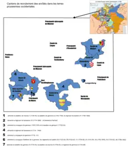 Les décrets des , et attribuèrent des zones de recrutement (Werbegebiete) ou cantons d'enrôlement (Enrollierungskantone) aux troupes respectives après que le roi Frédéric-Guillaume Ier avait demandé aux Chambres de la guerre et du domaine de procéder en au recensement de tous les feux de son royaume[1]. Pour ce faire, les fonctionnaires royaux se fondèrent sur les cadastres de la propriété foncière. Chaque district est assigné à un régiment[4]. Entre 5000 et 8500 feux sont attribués à un régiment d'infanterie et 1800 feux sont affectés à un régiment de cavalerie[5]. On parle ainsi de district de recrutement (Aushebungsbezirk)[1].