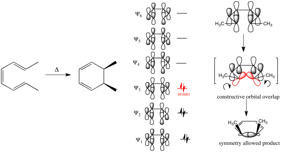 Par contre à la fermeture électrocyclique d'anneau de l'hexa-1,3,5-triène avec 6 électrons π, la réaction procède par un mécanisme disrotatoire.