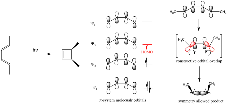 Au cas de la fermeture photochimique du buta-1,3-diène, l'orbitale devient la HO grâce à l'excitation électronique, et alors le mécanisme réactionnel sera disrotatoire.