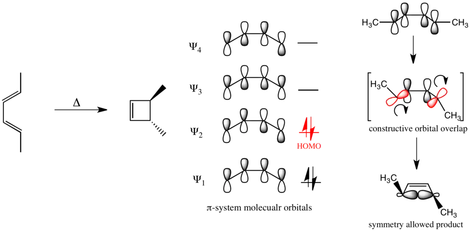À l'aide de ces règles on peut comprendre la stéréospécificité de la fermeture de cycle électrocyclique du buta-1,3-diène substitué indiqué ci-dessous. Le buta-1,3-diène possède 4 électrons π à son état fondamental et alors effectue la fermeture d'anneau par un mécanisme conrotatoire.