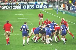 Une mêlée fermée ou ordonnée[3], généralement appelée simplement mêlée, est une manière de remettre le ballon en jeu de manière sûre et équitable lorsqu'une faute involontaire, comme un en-avant, a été commise.