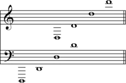 Ré est une note de musique une seconde majeure au-dessus du Do. Ses enharmonies sont Do double dièse et Mi![]()