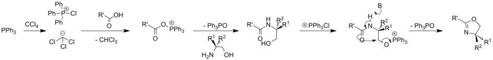 La réaction d'Appel est également efficace sur les acides caboxyliques ; de ce fait, elle a été utilisée pour les convertir en oxazolines, oxazines et thiazolines[13].