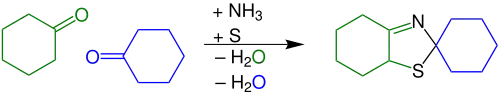 Une réaction de thiolation forme un intermédiaire α-mercaptocétone : L'α-thiolation est catalysée par une base - ici l'ammoniac- qui déprotone l'atome d'hydrogène en α de la cétone. La réaction est initiée par un énolate. Un cycle S8 du soufre élémentaire s'additionne sur la double liaison de l'énolate puis par protonation et réaction avec un autre énolate, forme une α-mercaptocétone et un polysulfure avec un soufre en moins qui par protonation et réaction avec d'autres énolates successivement forme de l'α-mercaptocétone jusqu'à ce qu'il soit lui-même une α-mercaptocétone.