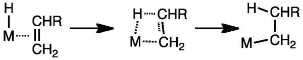 L'insertion d'éthylène et de propylène dans des alkyles-titane est la pierre angulaire dans la catalyse de Ziegler-Natta, la voie de production commerciale du polyéthylène et du polypropylène. Cette technique implique principalement des catalyses hétérogènes, mais il est couramment admis que les principes et les observations sur des systèmes homogènes sont applicables aux versions à l'état solide. Parmi les techniques proches, on compte le « procédé SHOP (en) » qui produit des précurseurs de détergent[25]. Les alcènes peuvent être coordonnés au métal avant insertion. En dépendance avec la densité du ligand sur le métal, la dissociation de ligand peut être nécessaire pour fournir un site de coordination à l'alcène[26].